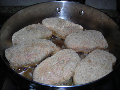 Set out 3 bowls. In one put some flour. In the second, beat a couple of eggs with a few tablespoons of water. Whisk in some parmesan cheese, pepper, and a pinch of red pepper. In the third, put some dry bread crumbs (I mix regular and Panko crumbs) seasoned with Parmesan cheese, pepper, garlic powder, red pepper, and a bit of seasoned salt.